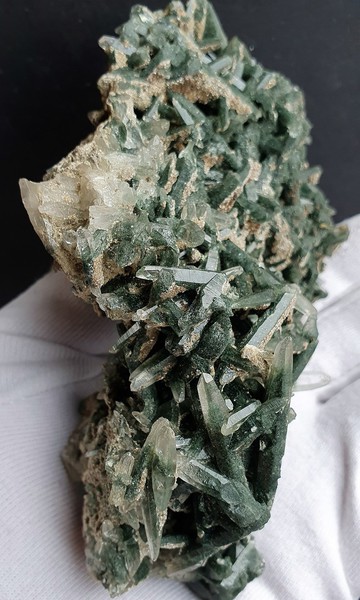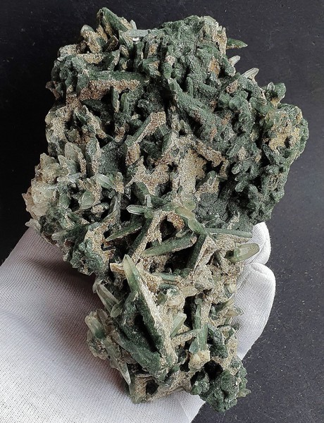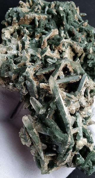 Diese Stufe besteht fast ganz aus unzähligen ineinander verwachsenen spindelförmigen Quarzen bis ca. 40 mm, die meist durch feine Chlorit-Einlagerungen grün gefärbt sind. Teils sind sie als Doppelender ausgebildet. Dazu gehören Beläge mit Muskowit. Gewicht: 368 g.