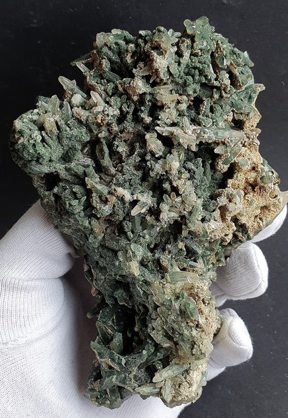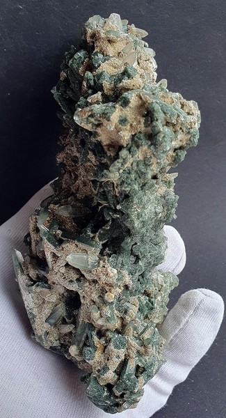 Diese Stufe besteht aus vielen, oft oberflächlich mit grünem Chlorit belegten Bergkristallen. Der größte, teils transparente Quarz misst ca. 120 mm. Oft haben die Chloritquarze mehrere Spitzen ausgebildet. Die Stufe ist rundherum mit Kristallen besetzt. Dazu gehören unscheinbare Perikline und Adulare, sowie etwas Muttergestein. Gewicht: 1176 g.
