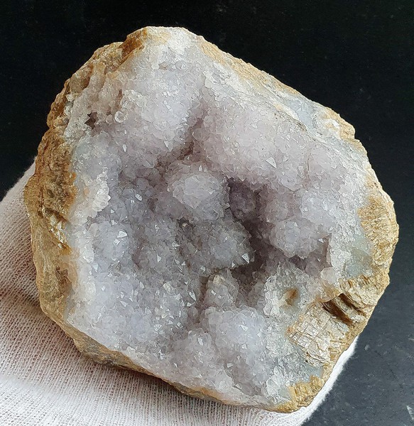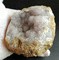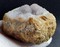 Um einen dichten Siderit-Kern herum sind viele linsenförmige Calcit-Kristalle bis ca. 30 mm gewachsen. Diese sind meist mit vielen winzigen Quarz-Kristallen überkrustet. Dazu gibt es noch Beläge von winzigen weißen, mir unbekannten Kristallen. Gewicht: 886 g.