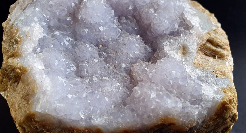 Über einem Kern aus derbem Siderit ist eine grau-blaue Kruste von amorphem Chalcedon gewachsen. In Partien ist wiederum der Chalcedon von zahllosen winzigen Calcit-Kristallen überwachsen. Gewicht: 294 g.