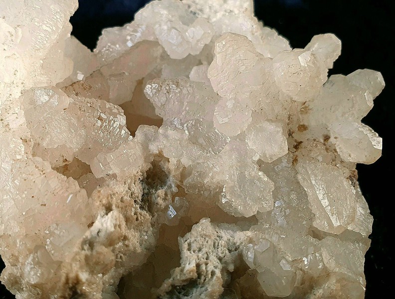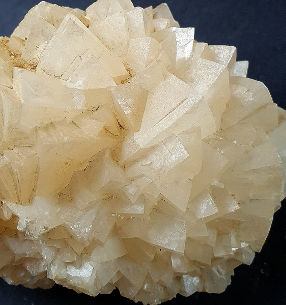 Bis auf wenig Gesteinsanhaftung besteht die Stufe igelartig aus vielen scharfkantigen, transparenten und beigen Calcit-Kristallen mit Kantenlängen bis ca. 20 mm. Gewicht: 580 g.