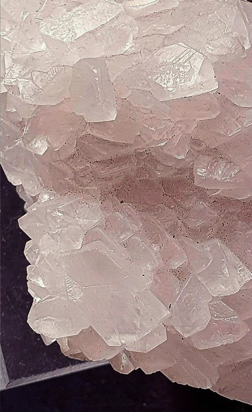 Der Magnesit hat viele transparente bis klare Kristalle bis ca. 15 mm ausgebildet. Die Stufe ist auf einen Acryl-Sockel gekittet Gewicht: 225 g.
