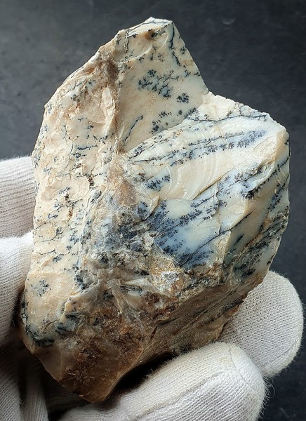 Diese Stufe besteht fast ganz aus Opal, der bläuliche Mangan-Dendriten ausgebildet hat. Diese sind an muscheligen Bruchflächen gut zu sehen. Gewicht: 147 g.