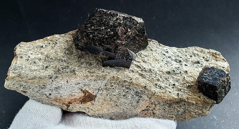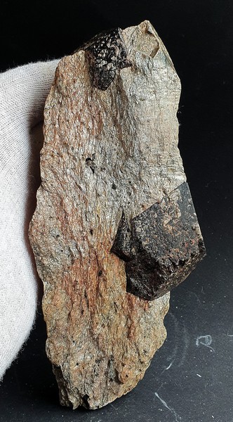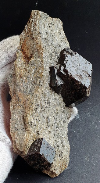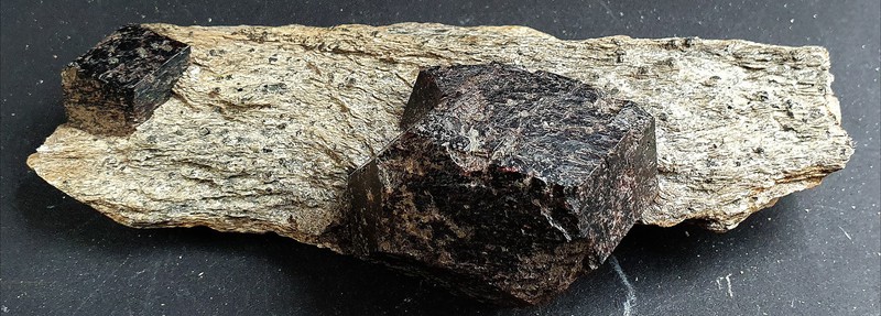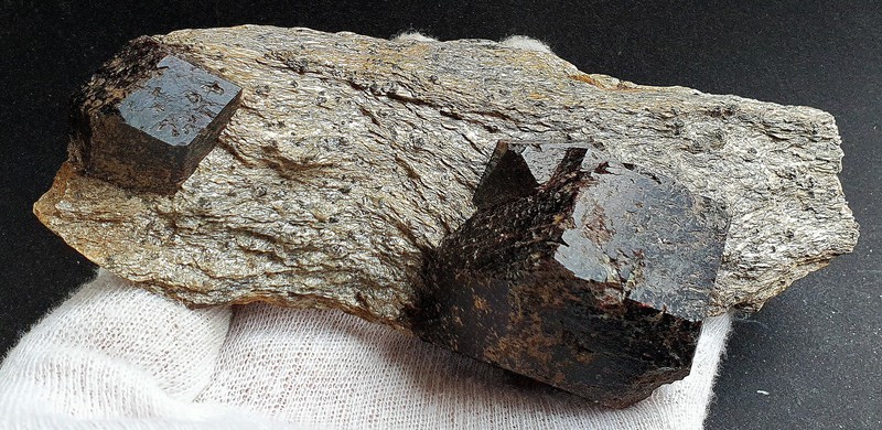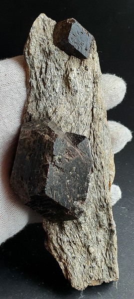 Im Glimmerschiefer sind zwei braun-rote und glänzende Almandin-Kristalle eingewachsen. Sie messen ca. 50 und 25 mm Durchmesser. Gewicht: 454 g.