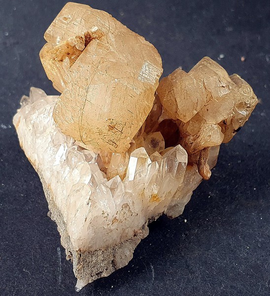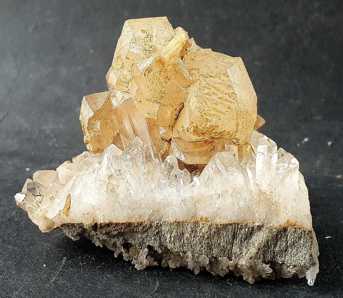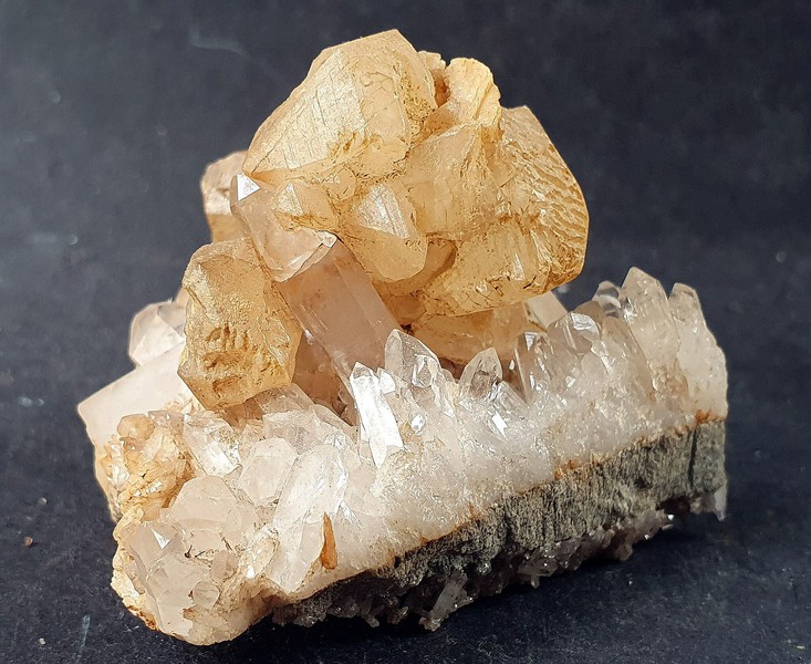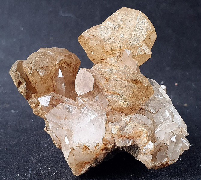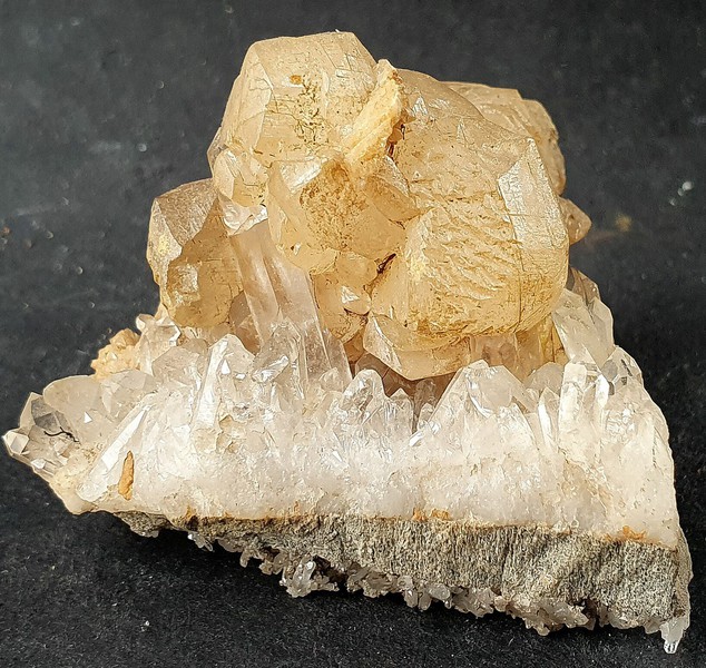 Auf einem Rasen recht klarer und glänzender Bergkristalle bis ca. 15 mm ist ein transparentes Aggregat aus mehreren Calcit-Rhomboedern bis ca. 30 mm gewachsen. Gewicht: 121 g.