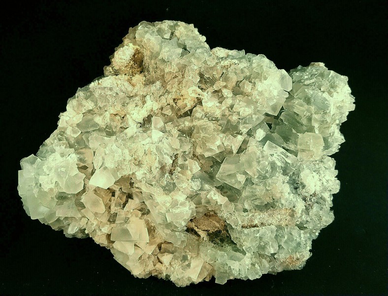 G1-C-3a: Rund um die Stufe sind viele matt glänzende bis klare, hellgrüne Fluorit-Kristalle bis ca. 14 mm gewachsen. Es gibt Partien mit beschädigten Fluoriten. Größe: ca. 120 x 100 x 50 mm / Gewicht: 813 g / 30,00 €