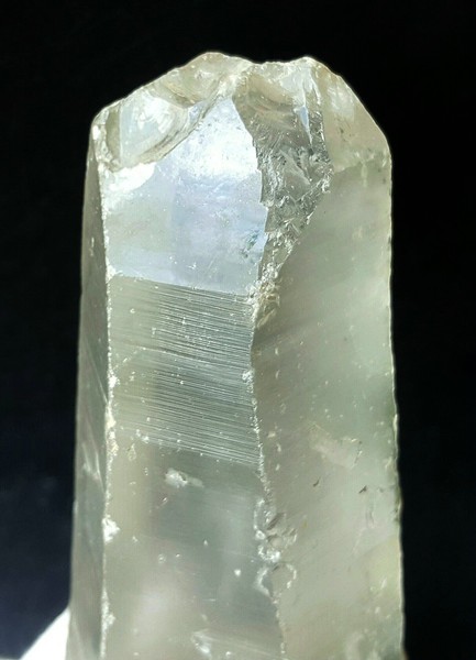 Der Bergkristall ist im Innern recht klar. Die Oberflächen sind durch natürliche Anlösung matt glänzend. Es gibt dort auch wenige Rutil - Kristalle bis 4 mm. Im Basis-Bereich gibt es verheilte Anwachserflächen.