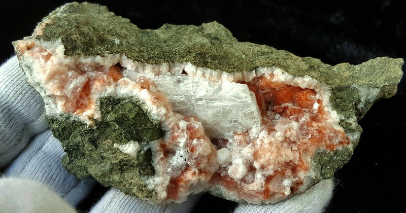 Eine Seite des Gneises ist bewachsen mit einem Rasen aus Periklinen bis ca. 9 mm und Adularen bis ca. 12 mm. Außerdem sind darauf reichlich glasklare Apatite gewachsen.Sie sind kugelig flächenreich ausgebildet und messen bis ca. 5 mm Durchmesser. Dazu ghört etwas Chlorit. Gewicht: 713 g
