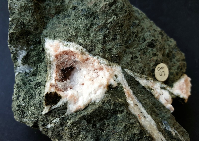 In einer Kaverne (ca. 30 mm) des Basalt-Gesteins sind einige hochglänzende nadelige Natrolith-Kristalle bis ca. 10 mm gewachsen. Die Kaverne ist komplett mit farblosen glänzenden Analcim-Kristallen bis ca. 4 mm ausgekleidet. Dazu gehört ein tafeliger klarer Apophyllit-Kristall von ca. 7 mm, der an einer Seite leider abgebrochen ist. Gewicht: 483 g