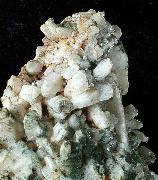 Diese Stufe besteht ganz aus Periklin-Kristallen, die teils mit Chlorit bewachsen sind. Die Perikline sind oft gelängt und messen bis ca. 30 mm. Wenige sind abgebrochen. Gewicht: 192 g.
