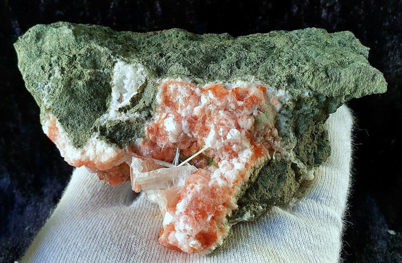 In radialstrahligen Aggregaten gibt es auf der Stufe einige transparente bis weiße nadelige Nathrolith-Kristalle bis ca. 10 mm. Auf dem dazugehörigen alten Fundortzettel steht als Fundort "Langkofel" und als Mineral "Desmin", allerdings beides so nicht richtig. Gewicht: 41 g.