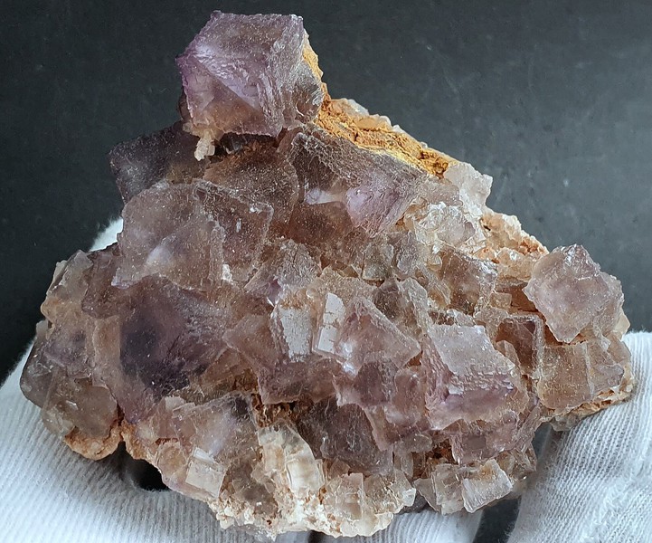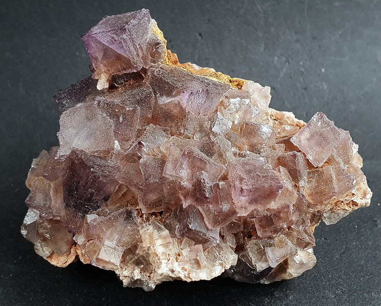G12-B(II)-33b: Reichlich hell-violette, klare und hochglänzende Fluorite bis ca. 20 mm / teils gelblicher Eisenhydroxid-Belag / Größe: ca. 75 x 45 x 40 mm/ Gewicht: 186 g / 45,00 €