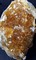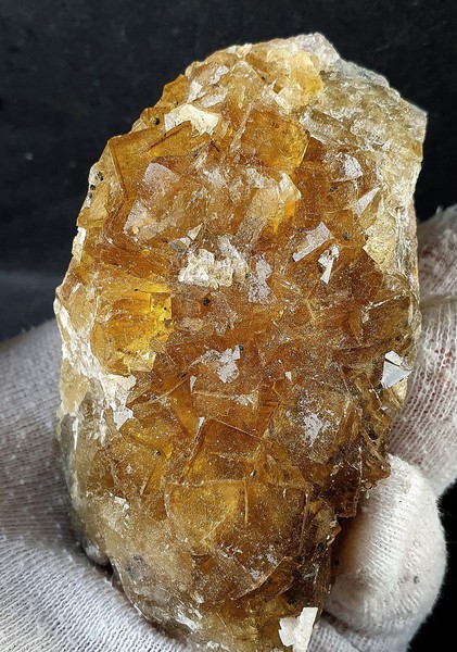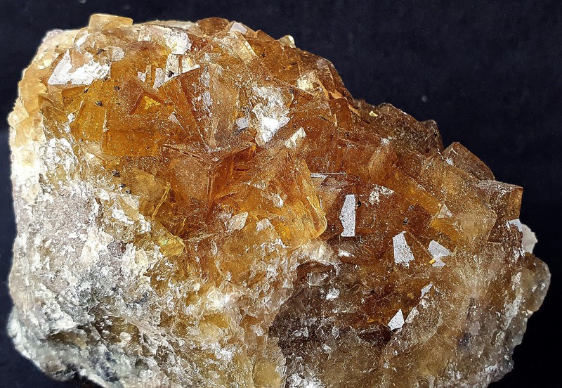 Vor allem eine Seite der Stufe ist reich besetzt mit honiggelben, recht klaren Fluorit-Kristallen bis ca. 10 mm Kantenlänge. Manche sind beschädigt. Auf den Fluoriten sitzen teils winzige Pyrite. Dazu gehört wenig weißer Dolomit. Gewicht: 423 g.