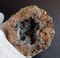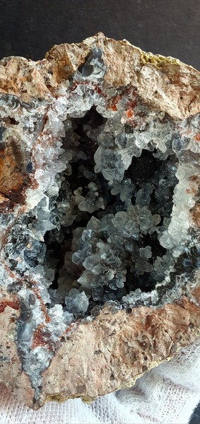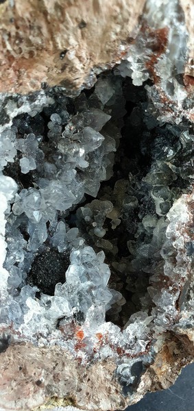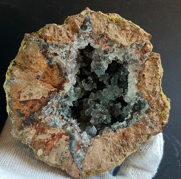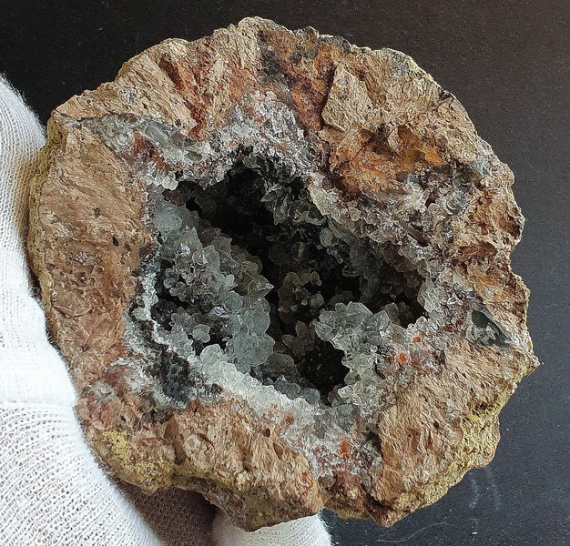 Im Innern dieser halben Rhyolith-Kugel (nicht geschnitten!) sind zahlreiche transparente Amethyst-Kristalle bis ca. 10 mm gewachsen. Dazu gibt es nierige kleine Aggregate von Aragonit und Ansammlungen winziger Hämatite. Gewicht: 414 g.