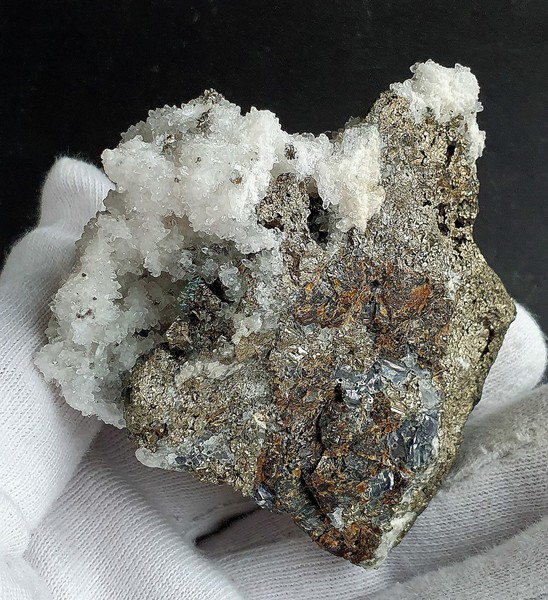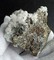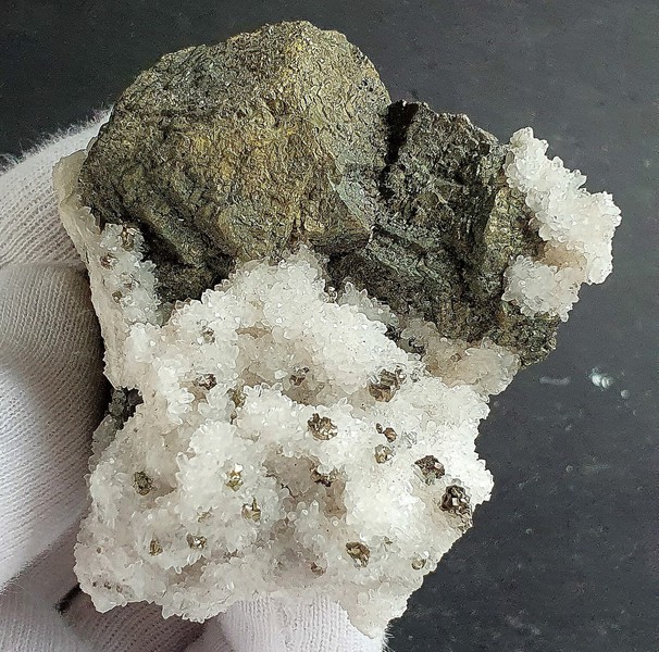 Die Stufe besteht zu einem Teil aus Pyrit, der auch einen Einzelkristall von ca. 30 mm ausgebildet hat. Der andere Teil zeigt viele hochglänzende weiße Quarz-Kriställchen, auf denen auch goldglänzende Chalkopyrite gewachsen sind. Gwicht: 159 g.
