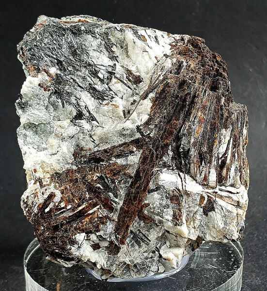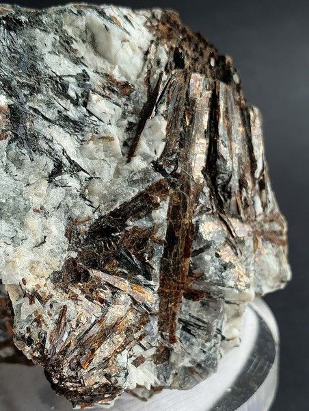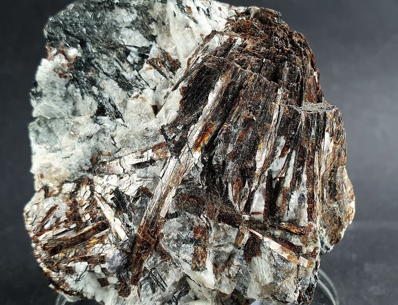 In Feldspat eingewachsen sind viel gold-braun glänzende Astrophyllit-Kristalle gewachsen. Sie messen bis ca. 50 mm. Dazu gehören dünne schwärzliche Aegirin-Kristalle. Gewicht mit Sockel: 270 g.