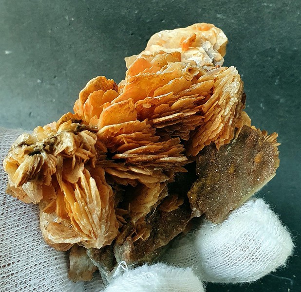 Die Stufen tragen viele weiße und typische fächer- oder rosettenartige Aggregate aus einem Gemisch von Aragonit und Calcit.