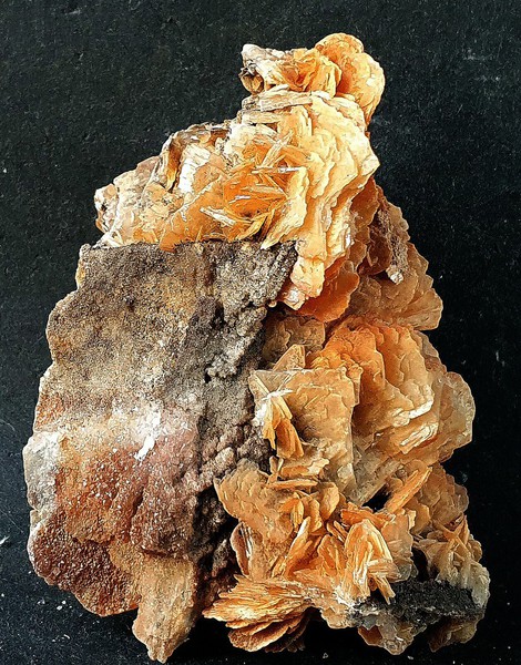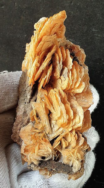 Die Stufe trägt viele Pakete aus dünntafeligen Baryt-Kristalle bis ca. 30 mm. Dazu gehören Rasen winziger glänzender Quarz-Kristalle. Gewicht: 173 g.