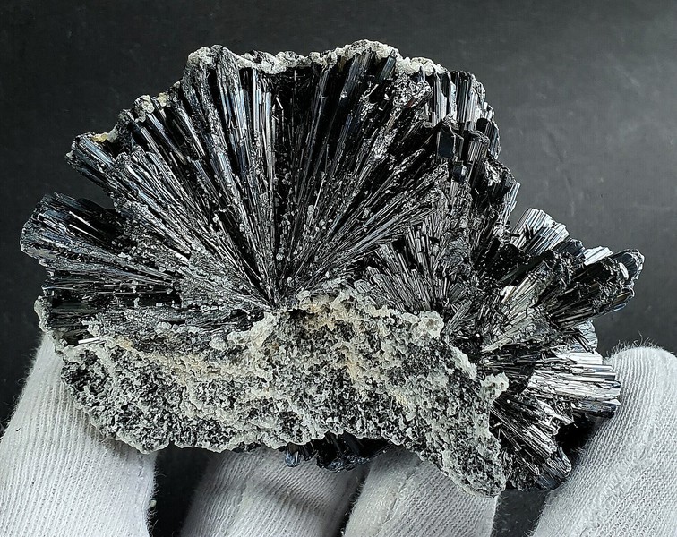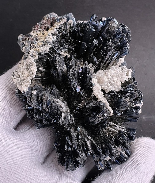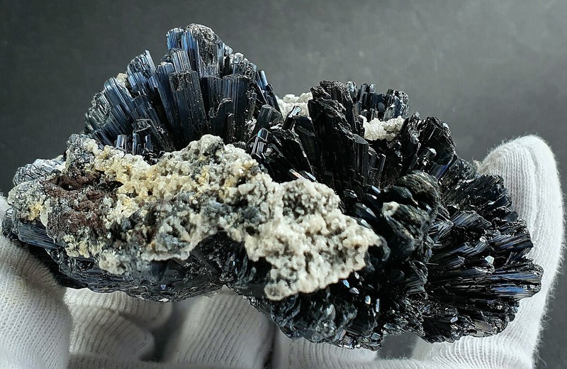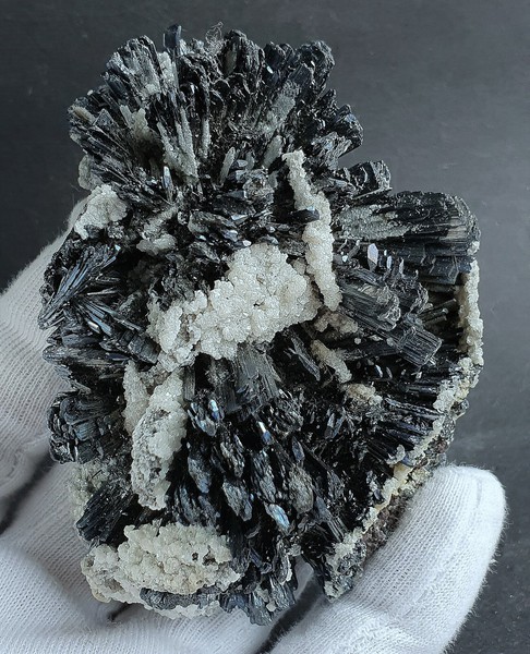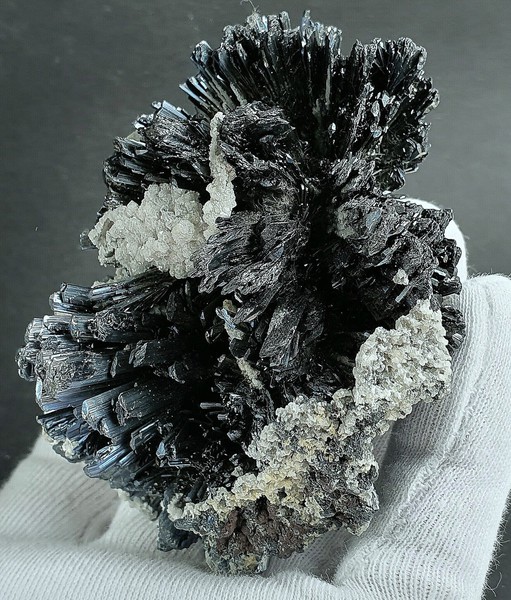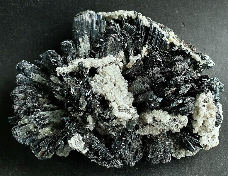 Diese Stufe ist reich besetzt mit metallisch glänzenden Stibnit-Kristallen. Sie messen bis ca. 35 mm, sind oft fächerförmig angeordnet und zeigen meist Endflächen. Dazwischen sitzen in hohem Kontrast weiße Ansammlungen und Krusten kleiner Rhodochrosit-Kristalle. Gewicht: 231 g.