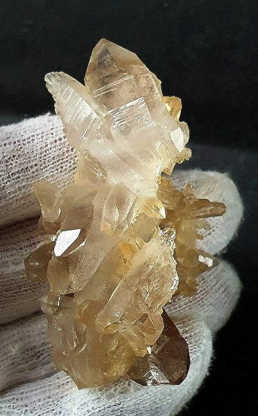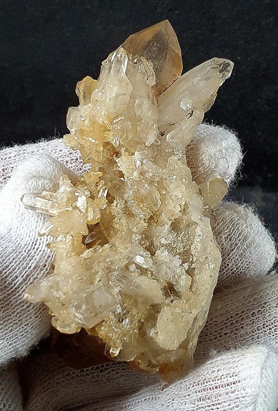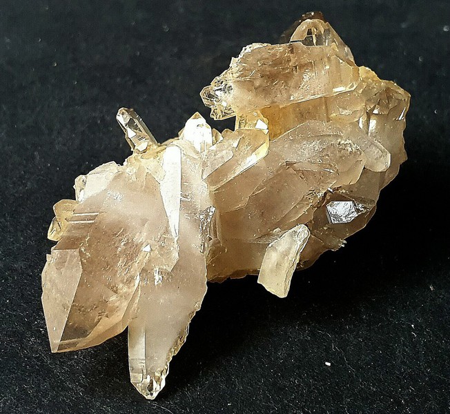 Die Stufe besteht rundherum aus vielen recht klaren und teils doppelendigen Quarz-Kristallen bis ca. 35 mm. Sie zeigen eine helle bräunliche Farbe mit einem minimalen Gelbstich. Gewicht: 57 g.