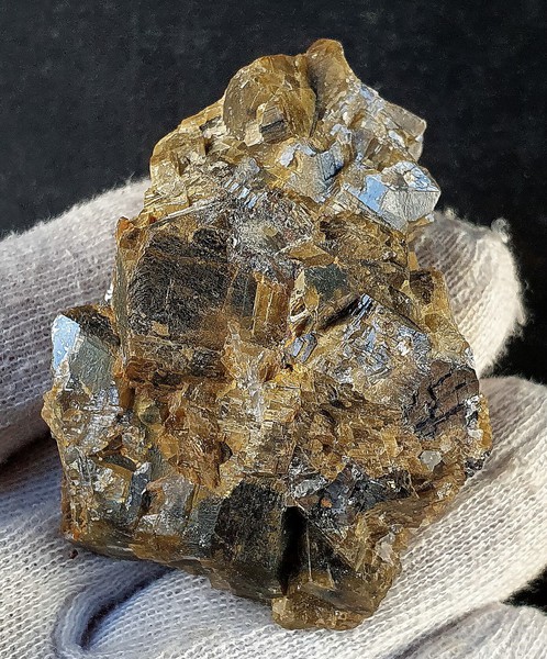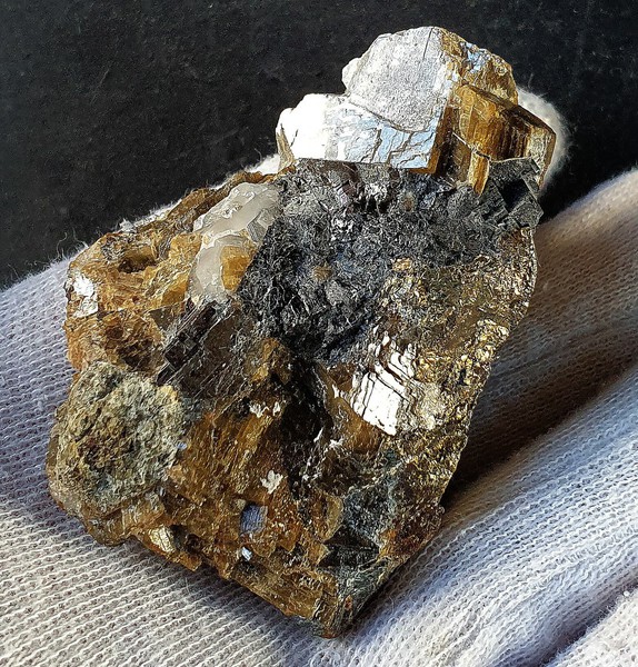 Die Stufe besteht aus ineinander gewachsenen, teils bestoßenen Kristallen braunen Siderits (mit Spaltflächen), goldgelbem Chalkopyrit sowie metallisch glänzendem parkettietem Galenit. Dazu gehören Einschlüsse von weißem Kryolith. Gewicht: 139 g.
