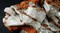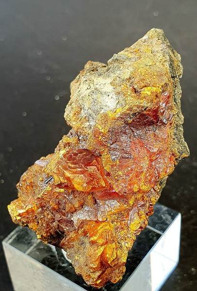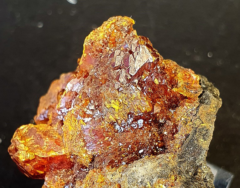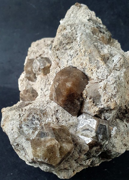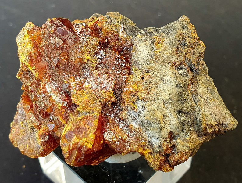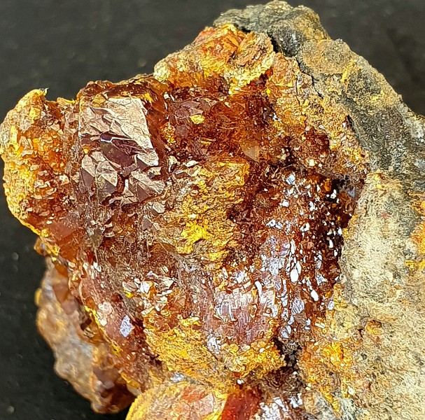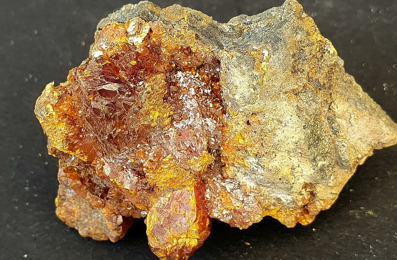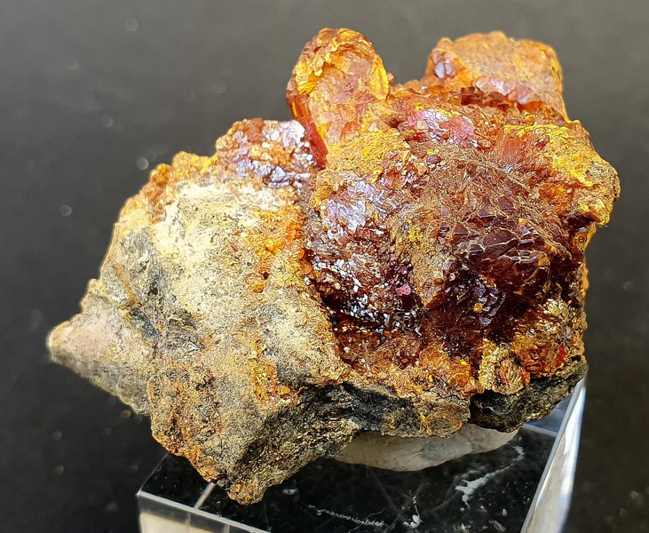 In Skarn-Gestein eingewachsen gibt es auf der Stufe einige gut kristallisierte und glänzende Grossulare bis ca. 25 mm Durchmesser. Manche sind beschädigt, manche intakt (siehe Bilder). Gewicht: 596 g.