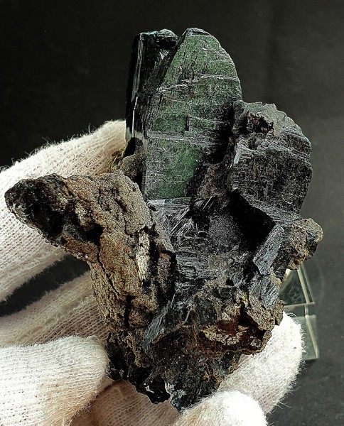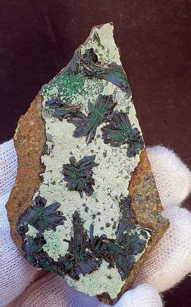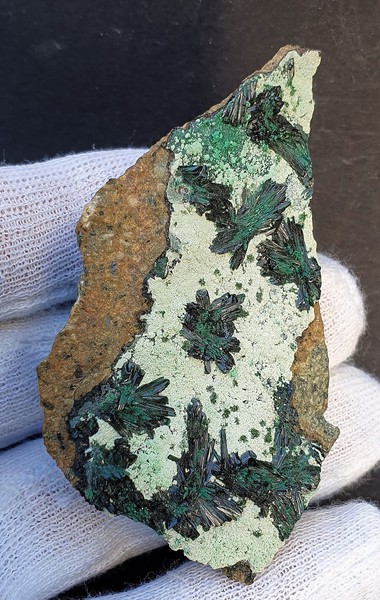 Auf einem Belag von hellgrünem Chrysokoll sind mehrere hochglänzende radialstrahlige Atacamit-Aggregate bis ca. 15 mm gewachsen. Die Einzelkristalle messen bis ca. 7 mm und zeigen eine intensiv dunkelgrüne Farbe sowie Endflächen. Gewicht: 67 g.