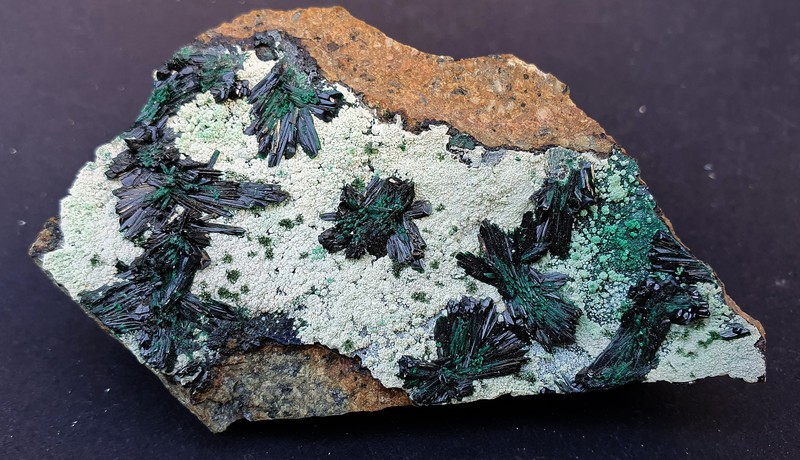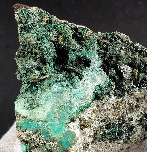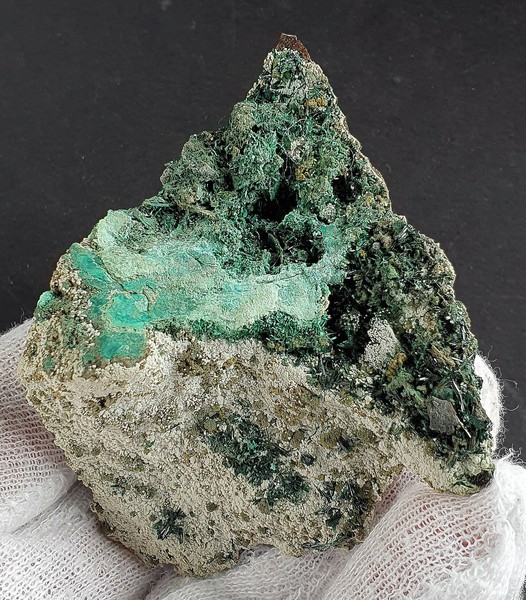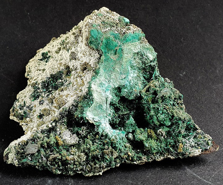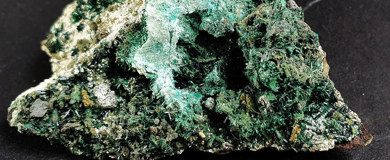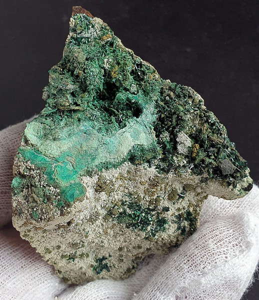 Die Stufe trägt viele intensiv grüne Atacamit-Nadeln von gutem Glanz. Dazu gehören hellgrüne Beläge von Chrysokoll. Gewicht: 74 g.
