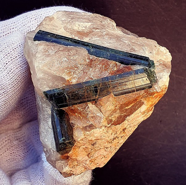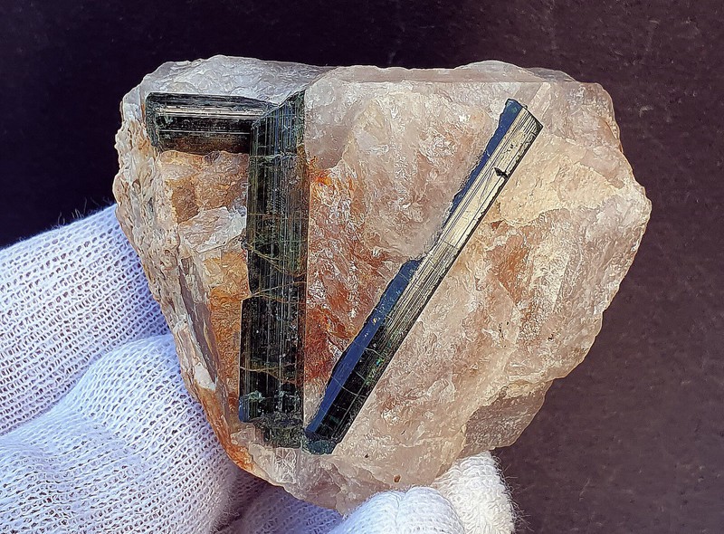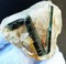 In derbem Quarz eingewachsen sind drei tiefgrüne und transparente Turmalin-Kristalle (Verdelithe). Sie messen bis ca. 40 mm und weisen teils im Innern Lichtreflexe auf. Gewicht: 120 g.