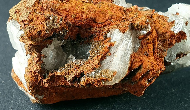 In Kavernen des limonitisierten Gesteins sind viele farblose Hemimorphit-Kristalle bis ca. 15 mm gewachsen. Diese sind transparent bis klar, zeigen hohen Glanz und weisen häufig Endflächen auf. Gewicht: 77 g.