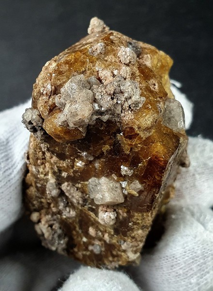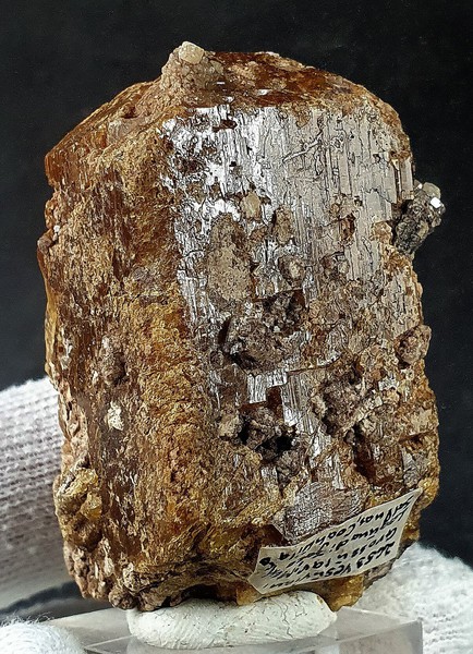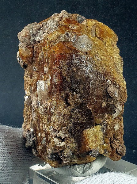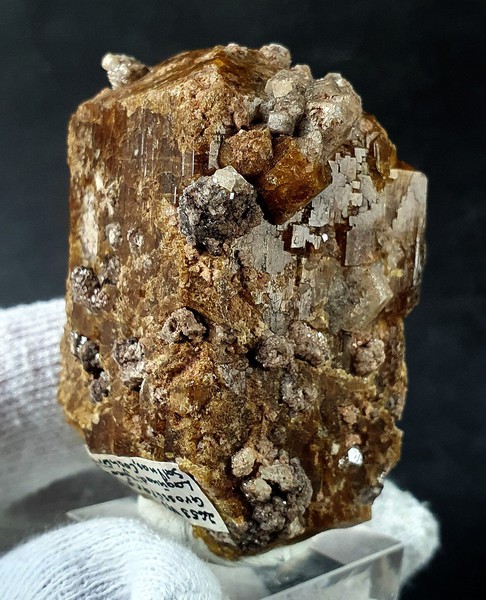 Der teils transparent und intensiv gefärbte Vesuvianit-Kristall zeigt parkettierte Strukturen auf den Flächen sowie auch an beiden Enden Endflächen. An den Enden gibt es jeweils Ausbrüche. Der Kristall ist bewachsen von diverseb farblosen und glänzenden Grossular-Kristallen bis ca. 7 mm. Gewicht: 139 g.
