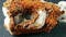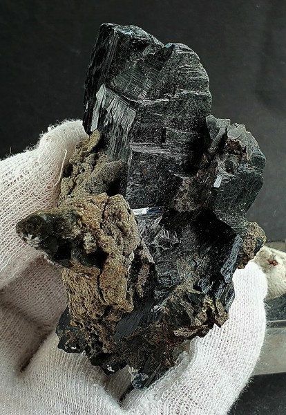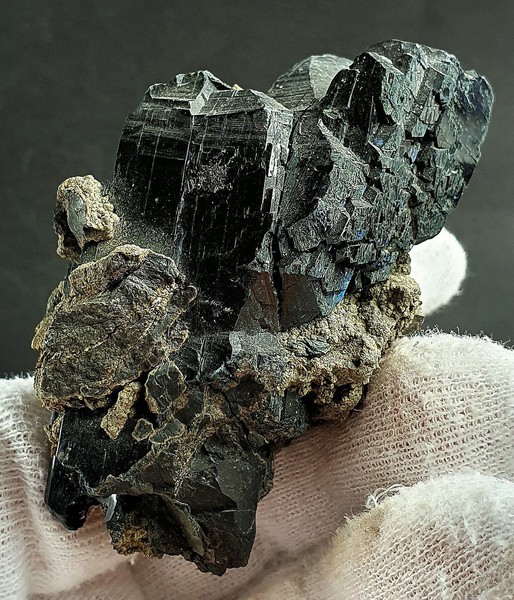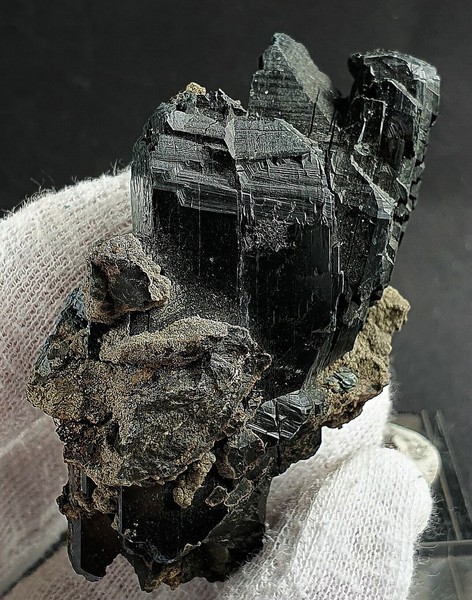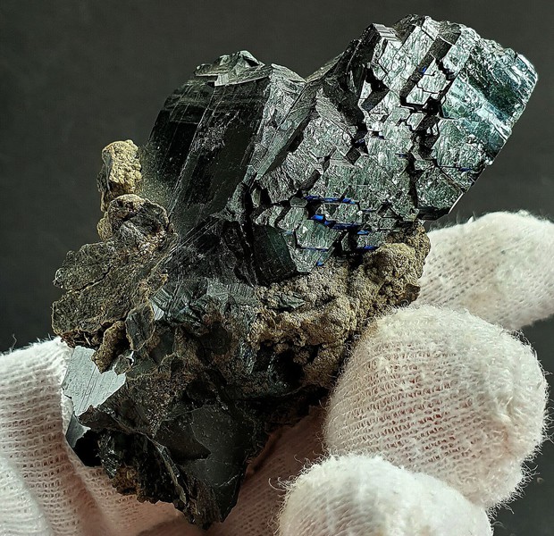 Die Stufe trägt mehrere schwärzlich-hochglänzende Vivianit-Kristalle. Sie messen bis ca. 50 mm und zeigen vielfache Endflächen. Dazu gibt es angewachsene Krusten bestehend aus vielen winzigen Pyrit-Kristallen. Gewicht: 101 g.