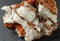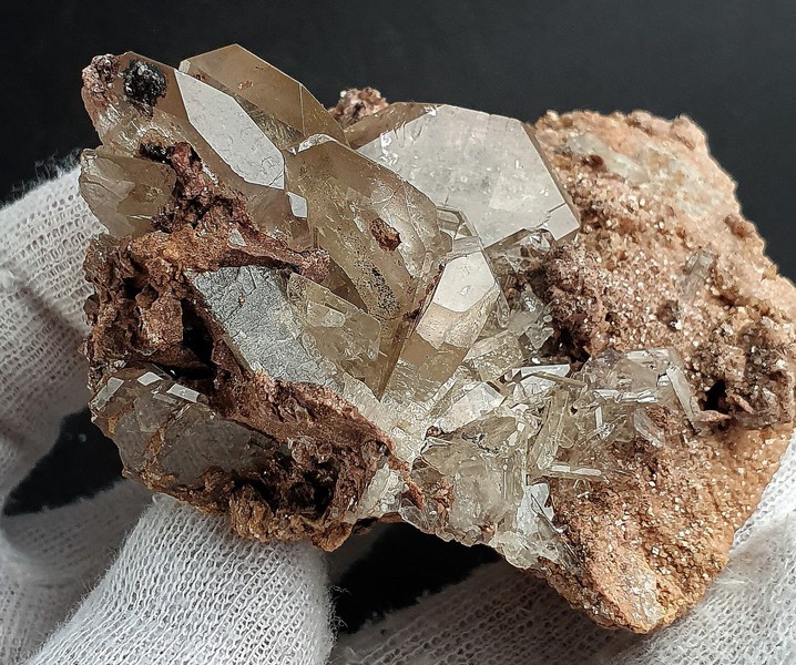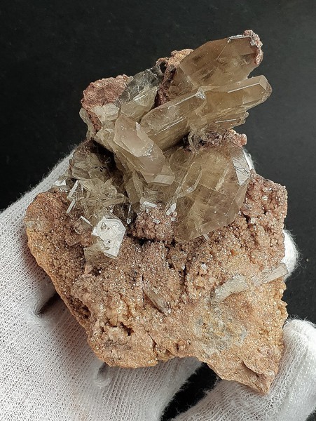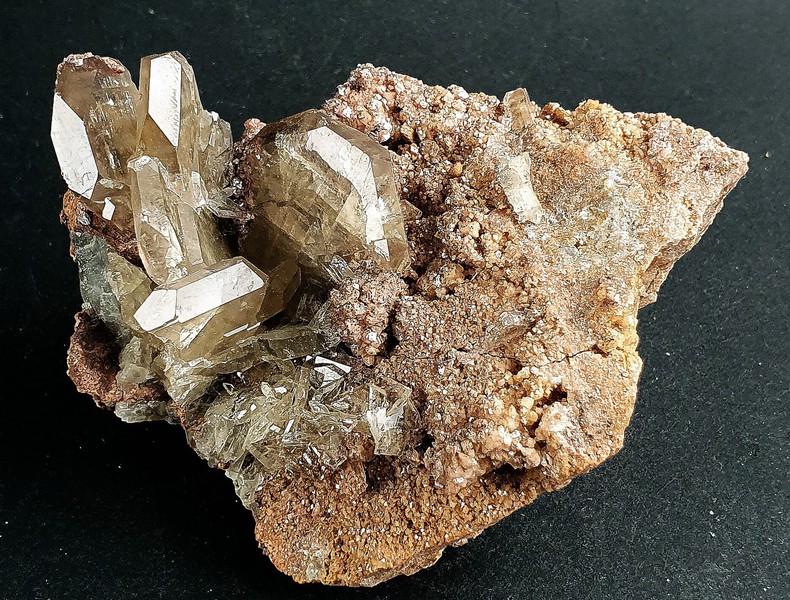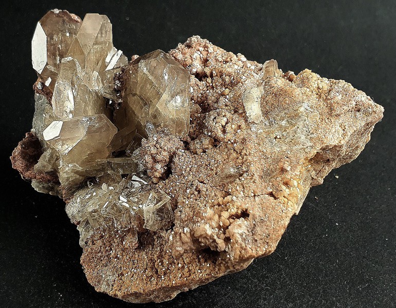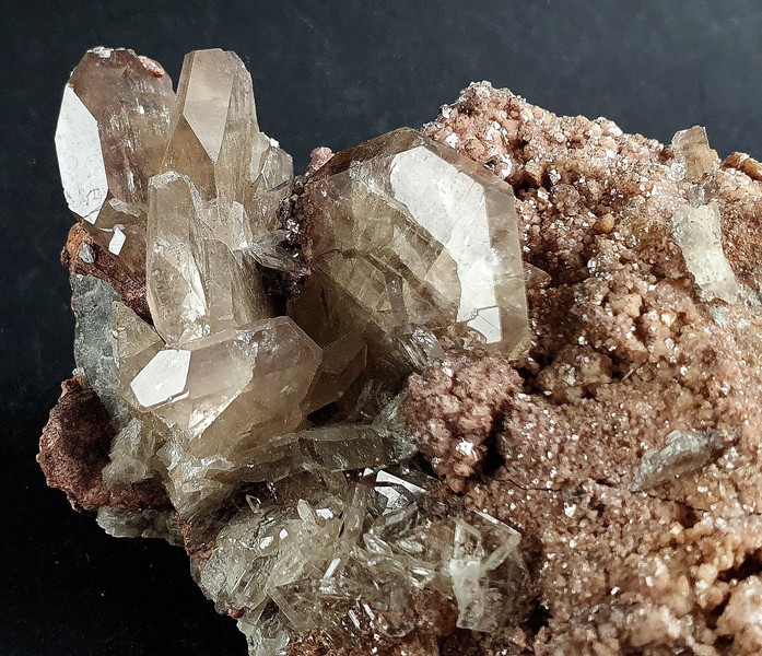 Diese Stufe besteht aus einigen sehr scharfkantigen und transparenten bis klaren Calcit-Skalenoedern bis ca. 60 mm. Diese weisen durch Einschlüsse von winzigen Hämatit-Partikeln teils einen rötlichen Belag auf, der auch Phantomkanten im Innern der Calcite bildet. Gewicht: 574 g.