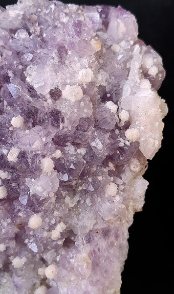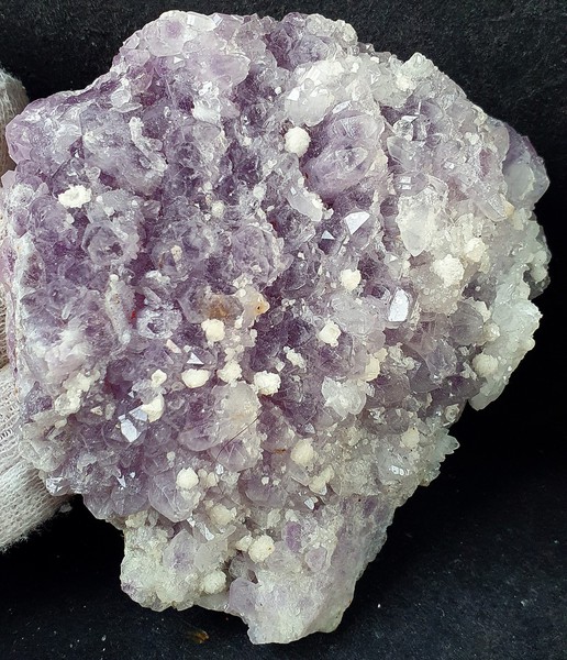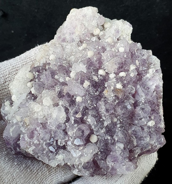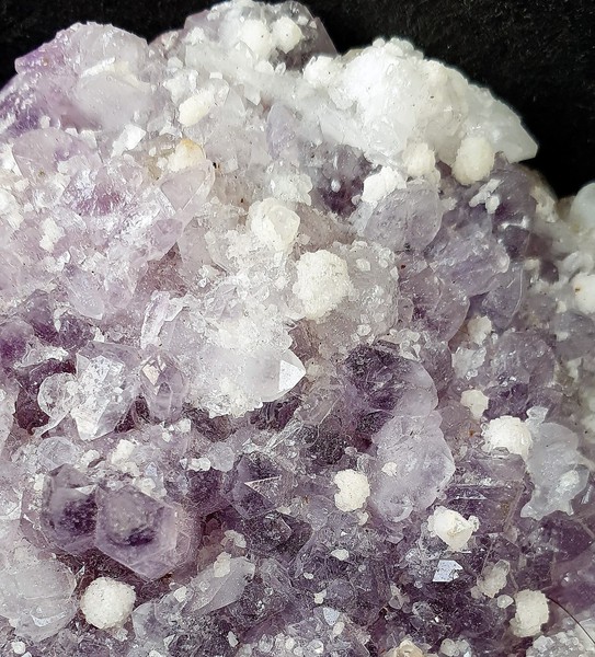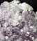 Auf dünner Matrix sind viele kurzprismatische und transparente Amethyst-Kristalle bis ca.10 mm gewachsen. Darauf sind einige weiße, halbkugelige Aggregate aus Cleavelandit-Kristallen um 3 - 4 mm gewachsen. Gewicht: 189 g.
