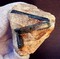 Die Stufe trägt neben recht klaren Bergkristallen bis ca. 25 mm vor allem einen Quarz - Japan - Zwilling. Die Schenkel dieses flachen Kristalls messen ca. 20 und 18 mm. Am Ende des spitzigeren Schenkels gibt es eine Absplitterung von ca. 5 mm ( siehe Bilder 2 und 4). Gewicht mit Sockel: 62 g.