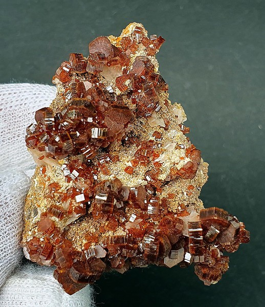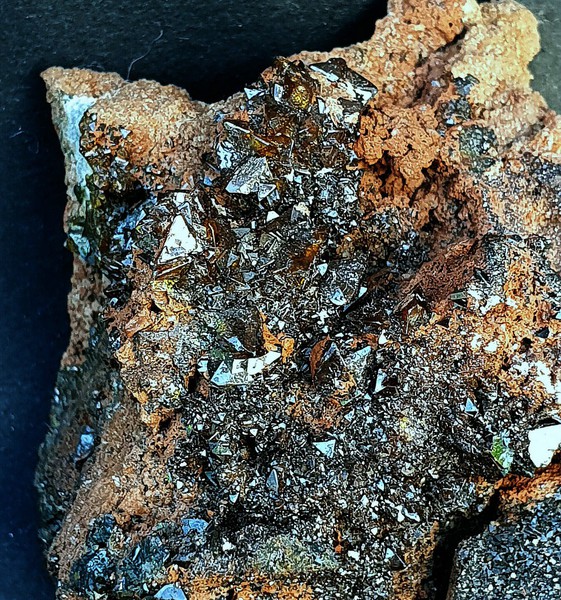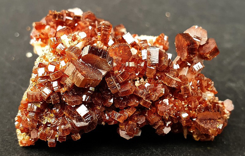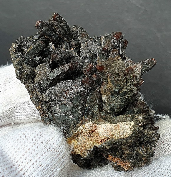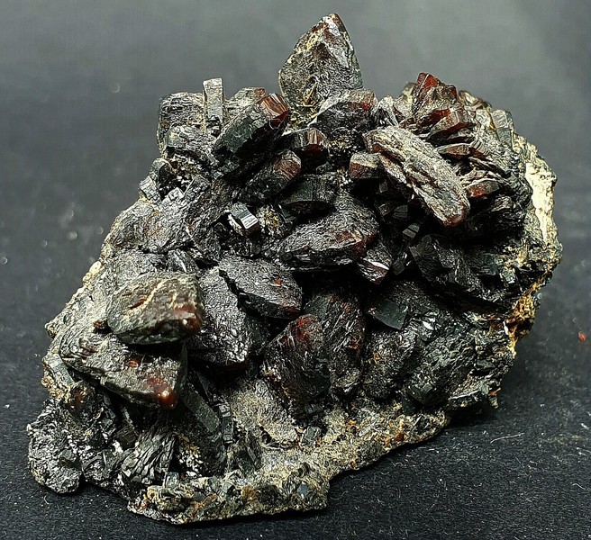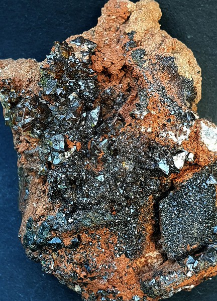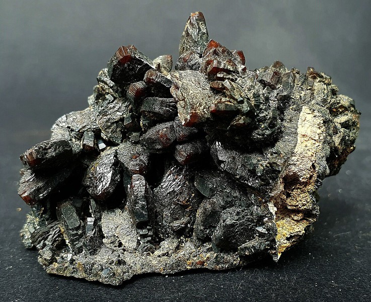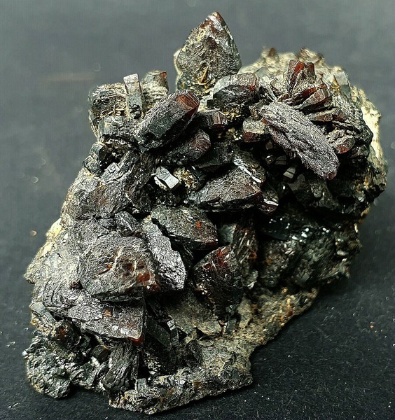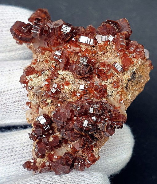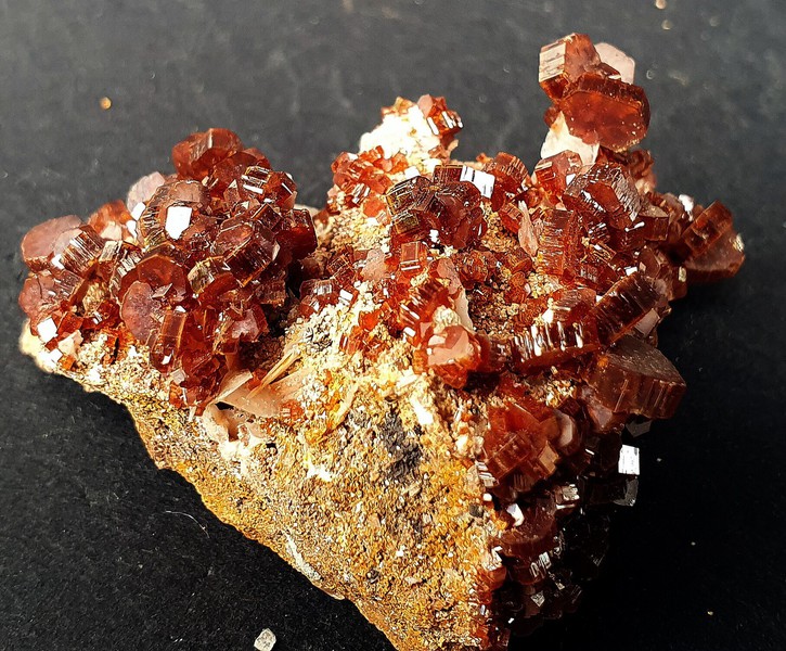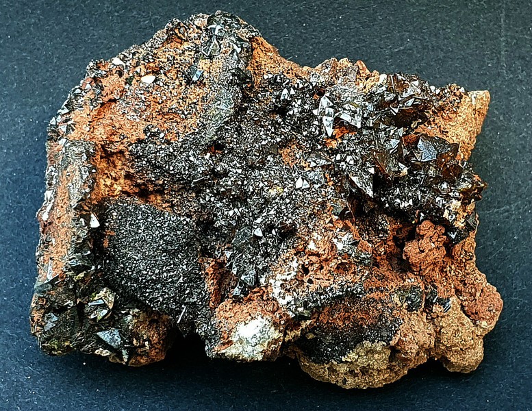 Diese Stufe trägt sehr viele transparente und hochglänzende, ideal ausgebildete Descloizit-Kristalle. Sie messen bis ca. 4 mm und weisen eine braun-rote Farbe auf. Gewicht: 81 g.