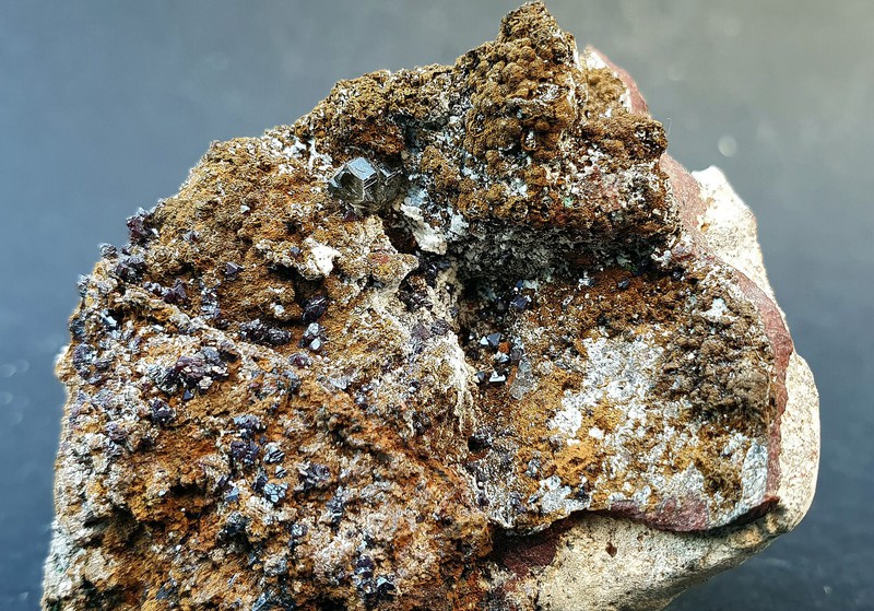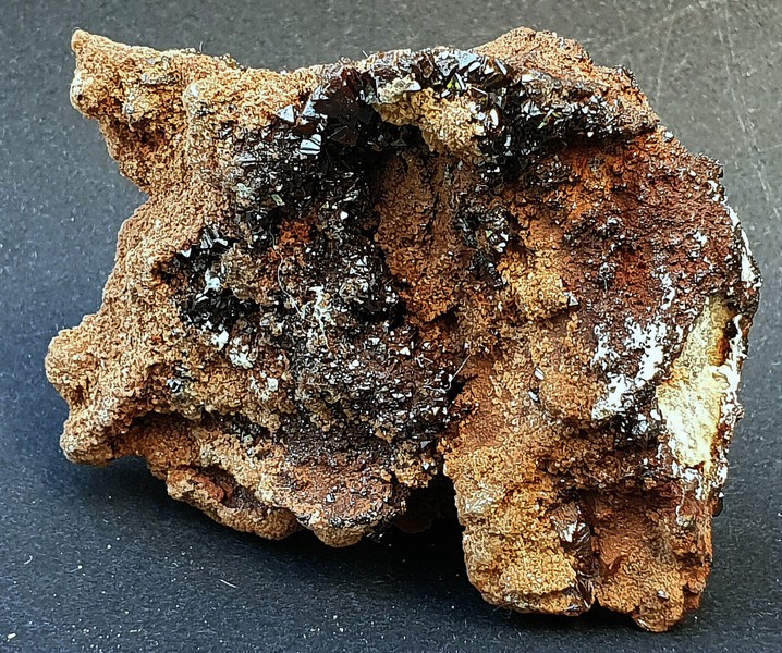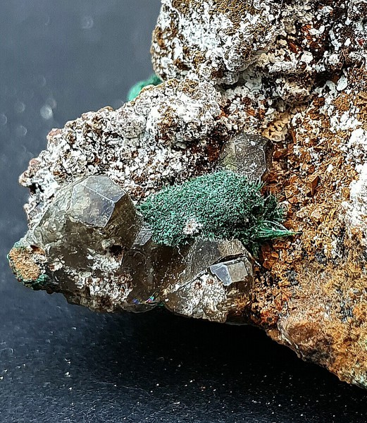 Auf limonitisierter Matrix sind an verschiedenen Stellen recht klare und hochglänzende Cerussit-Kristalle bis ca. 8 mm gewachsen. Eine Partie der Stufe trägt viele kleine hochglänzende Descloizit-Kristalle um 1 mm. Dazu gehören zwei grüne Malachit-Ansammlungen aus nadeligen Kristallen. Gewicht: 72 g.