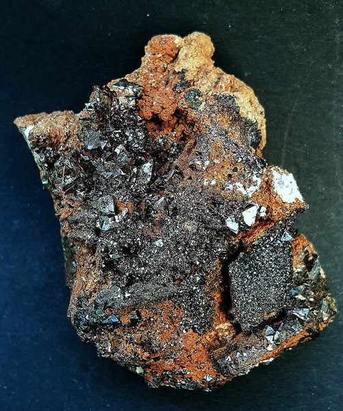 Die Stufe trägt viele typische Descloizit-Kristalle. Diese messen bis ca. 15 mm und sind an den Spitzen leicht transparent und rötlich. Gewicht: 96 g.