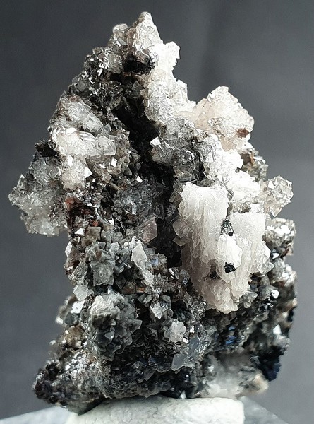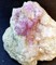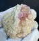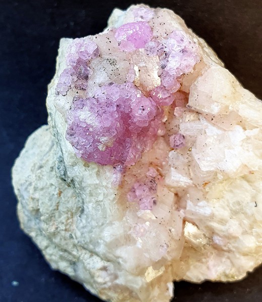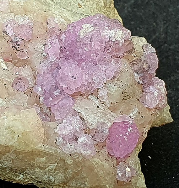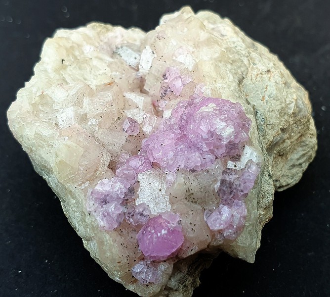 Auf einem Rasen farbloser Dolomit-Kristalle bis ca. 7 mm sind an einer Stelle rhomboedrische Calcit-Kristalle bis ca. 5 mm gewachsen. Diese zeigen durch Beimengung von Kobalt eine intensiv rosa Farbe. Gewicht: 78 g.