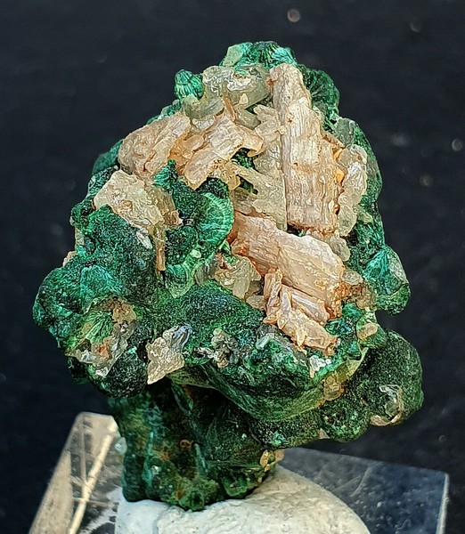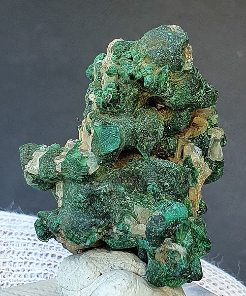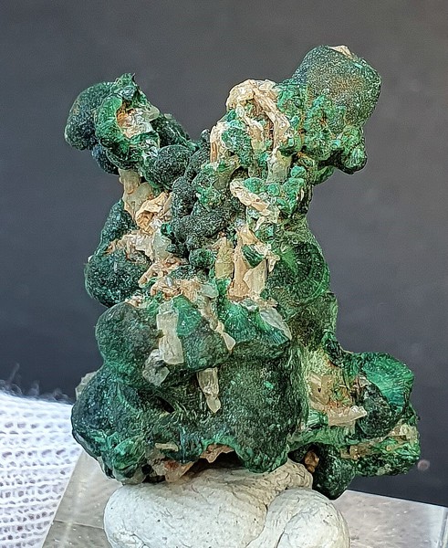 Die Stufe besteht zum großen Teil aus grünen, konzentrischen Malachit-Halbkugeln von mattem Glanz. Dazwischen sitzen auf verschiedenen Seiten mehrere beigefarbige Cerussit-Kristalle bis ca. 10 mm, teilweise verzwillingt. Gewicht: 26,00 €