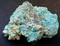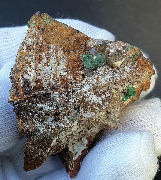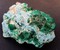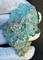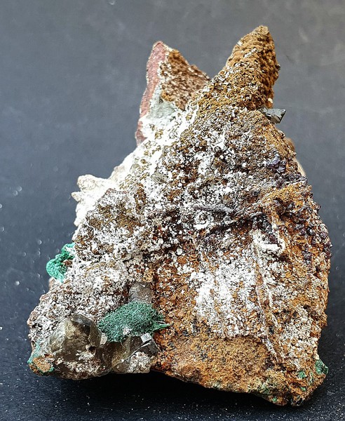 Auf allen Seiten der Stufe gibt es grüne Beläge und auch Nädelchen von Malachit zusammen mit braunem Limonit. Gewicht: 157 g.