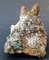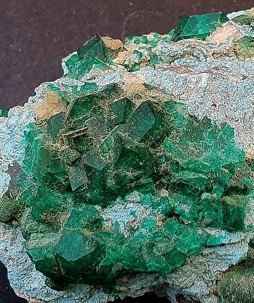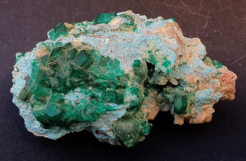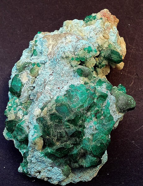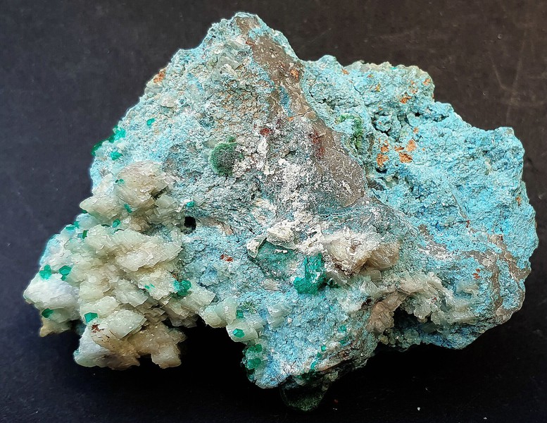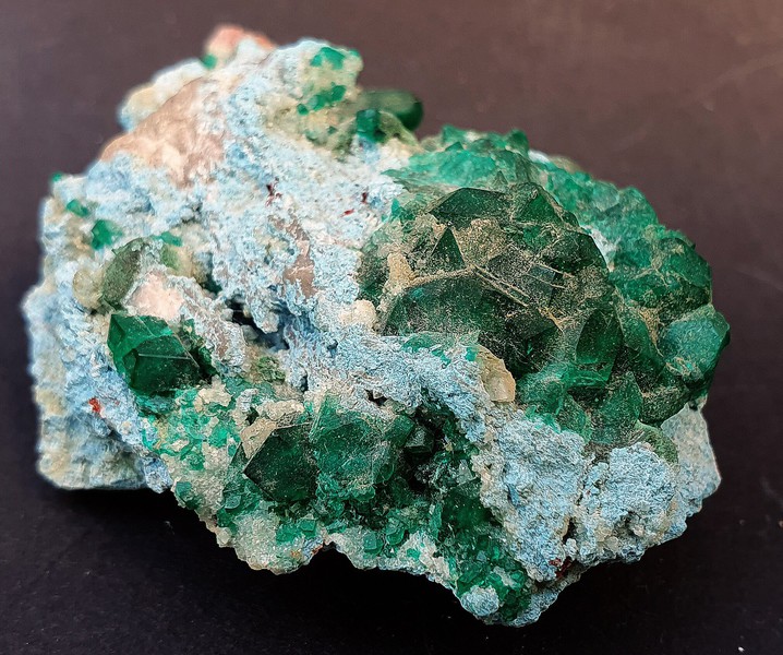 Rundherum ist die Stufe mit blau-grünem Plancheit überzogen. Darauf sitzen an verschiedenen Partien reichlich matt-dunkelgrüne Dioptas-Kristalle bis ca. 9 mm. Dazu gehören einige halbkugelige grüne Malachit-Aggregate bis ca. 12 mm, die auch Dioptase bedecken. In einer Ansammlung glänzender Calcit-Kristalle sind auch kleine klare und hochglänzende Dioptase gewachsen. Gewicht: 63 g.