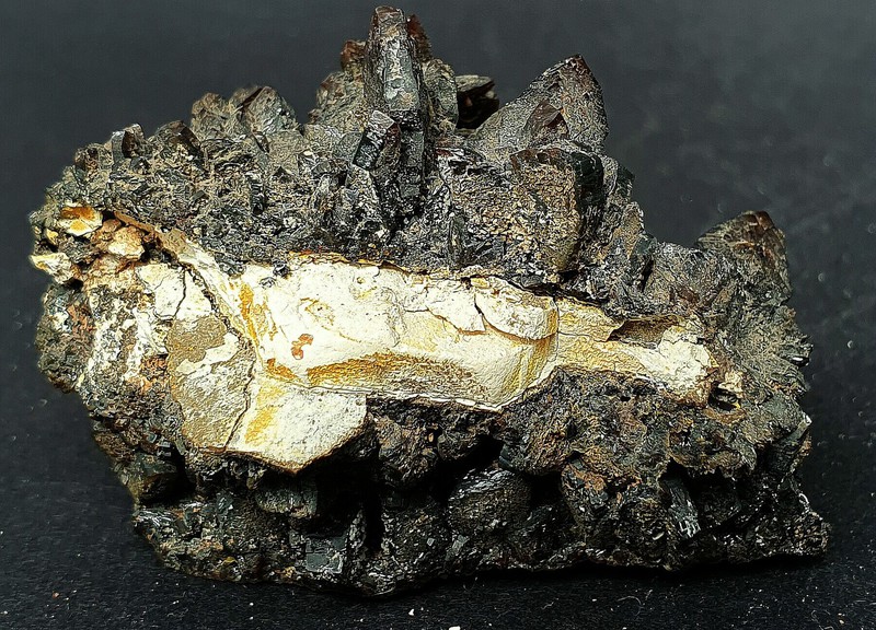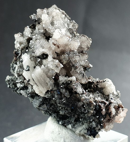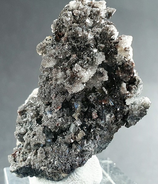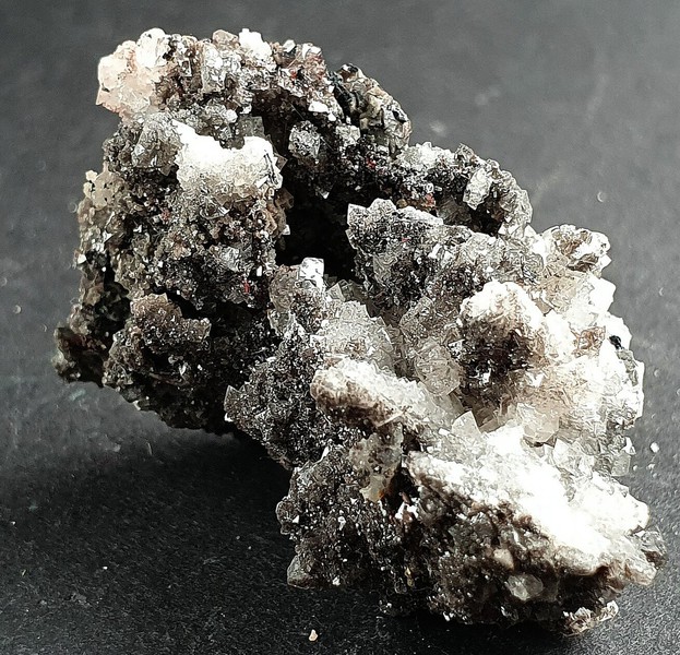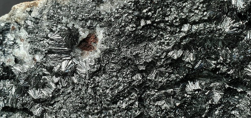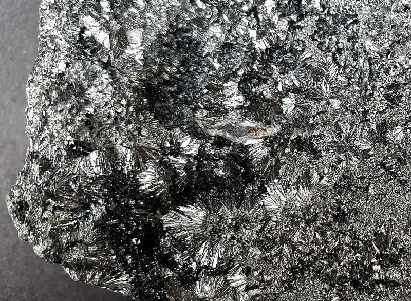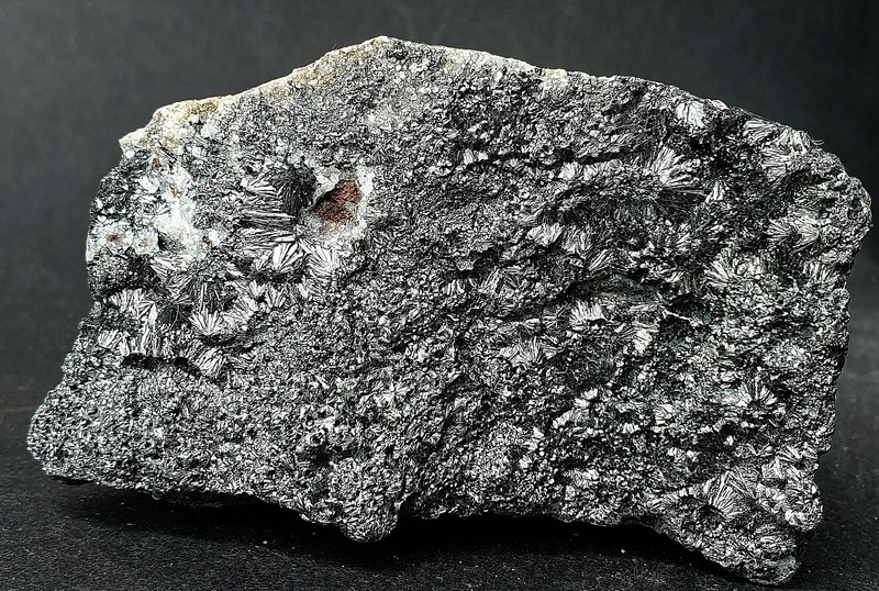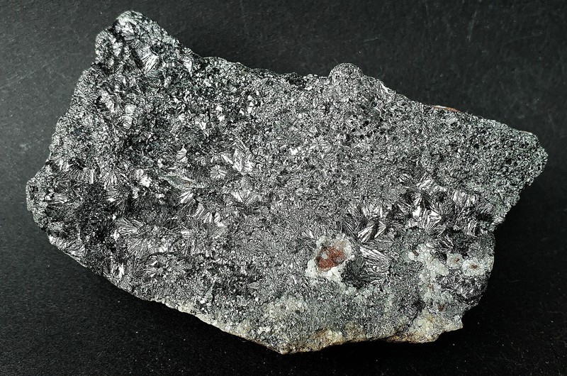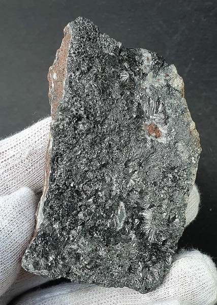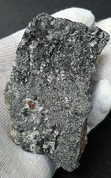 Eine Seite der Stufe ist komplett bewachsen mit silbrig glänzenden und teils radial-strahlig angeordneten Pyrolusit-Kristallen bis ca. 5 mm. Gewicht: 132 g.