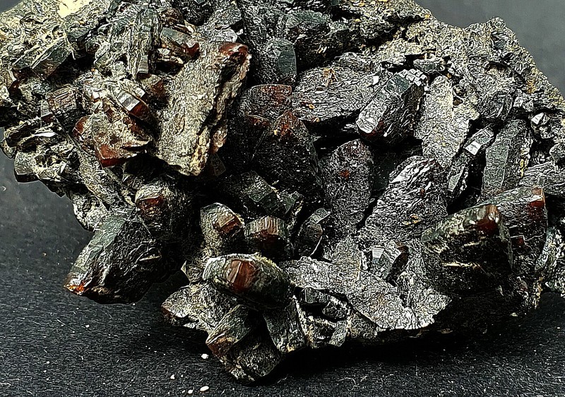 Die durch Hämatit-Einschlüsse rot-braunen Quarze messen bis ca. 14 mm. Sie weisen teils einen dünnen Belag von Limonit auf. Manche sind etwas beschädigt. Gewicht: 284 g.