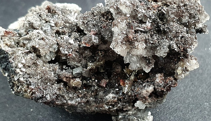 Die Stufe ist rundherum mit glänzenden Smithsonit-Kristallen um 1 mm bewachsen. Dazwischen gibt es wenige nadelige Mimetit-Kristalle bis ca. 2 mm und etwas weißen Cerussit. Gewicht: 32 g.