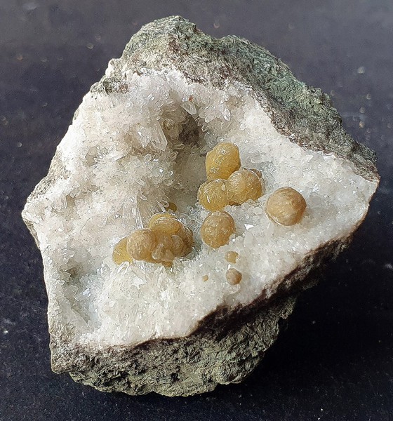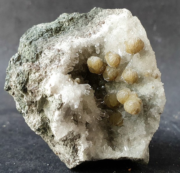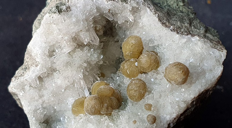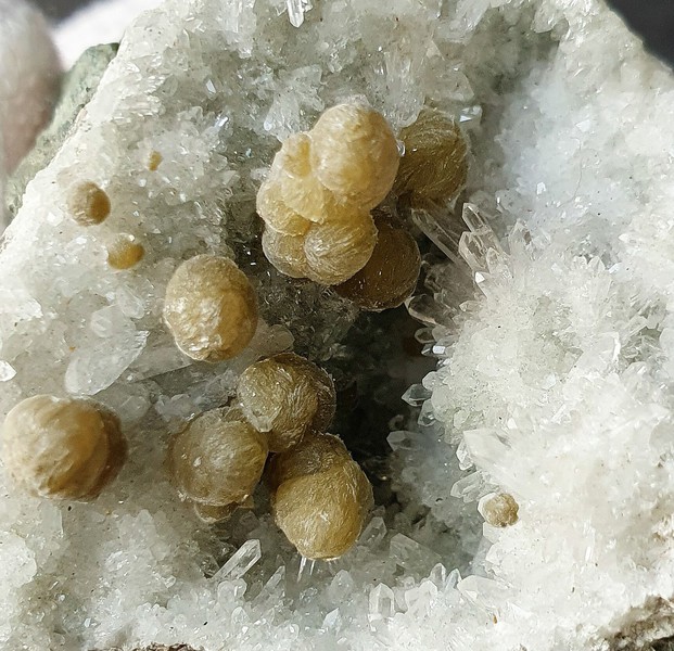 In einer Kaverne des Vulkangesteins sind viele kleine, recht klare Quarz-Kristalle gewachsen. Darauf sitzen etliche hellgrüne kugelige Gyrolith-Aggregate bis ca. 6 mm. Gewicht: 81 g.