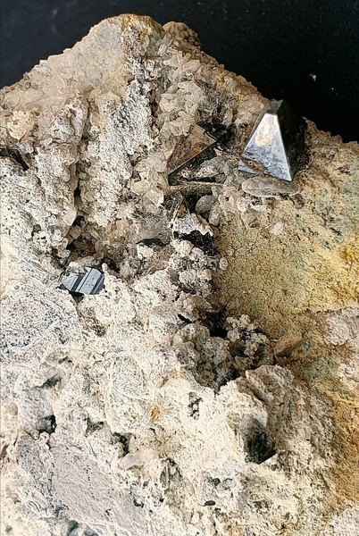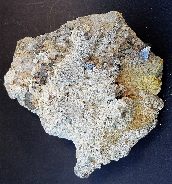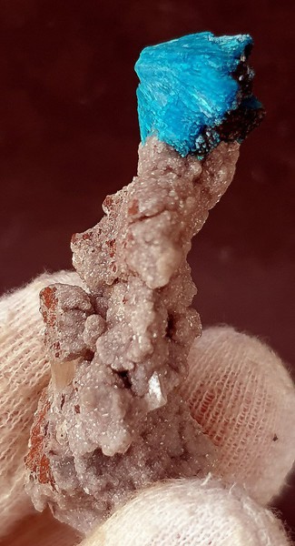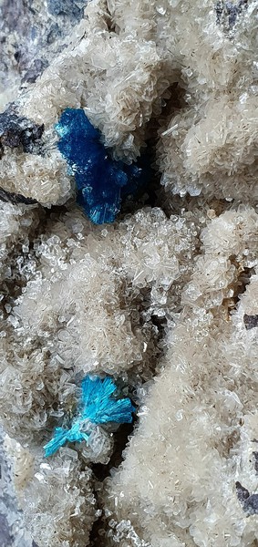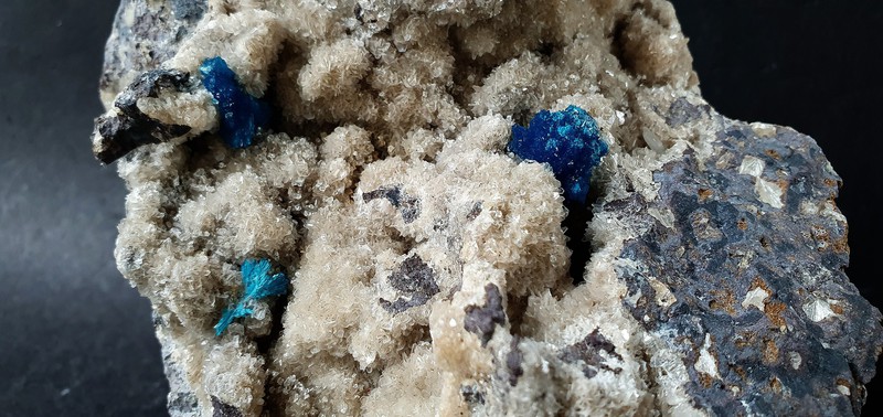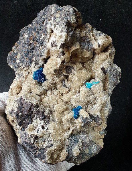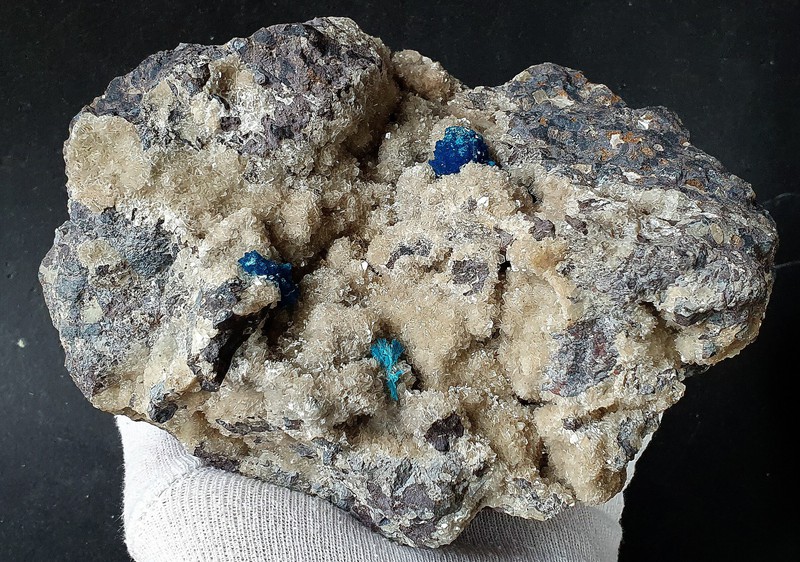 In Basalt-Breckzie ist in Kavernen ein hochglänzender Rasen aus unzähligen winzigen Stilbit-Kristallen gewachsen. Darauf gibt es drei intensiv blaue Aggregate aus Cavansit-Kristallen. Das größte Aggregat misst ca. 15 mm und ist intensiv tintenblau. Gewicht: 1503 g.