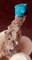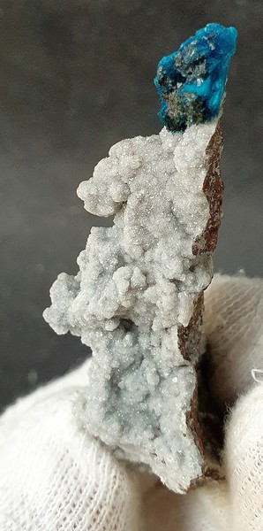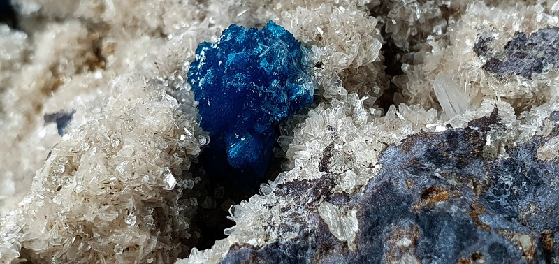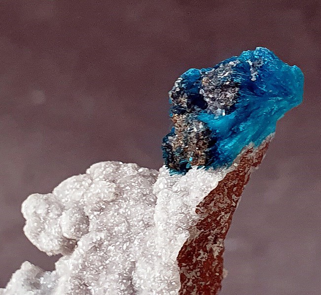 Auf mit vielen winzigen Stilbit-Kristallen besetzter Matrix sitzt eine Cavansit-Garbe. Diese ist intensiv blau und misst ca. 12 x 10 x 6 mm. Gewicht: 14 g.