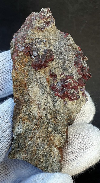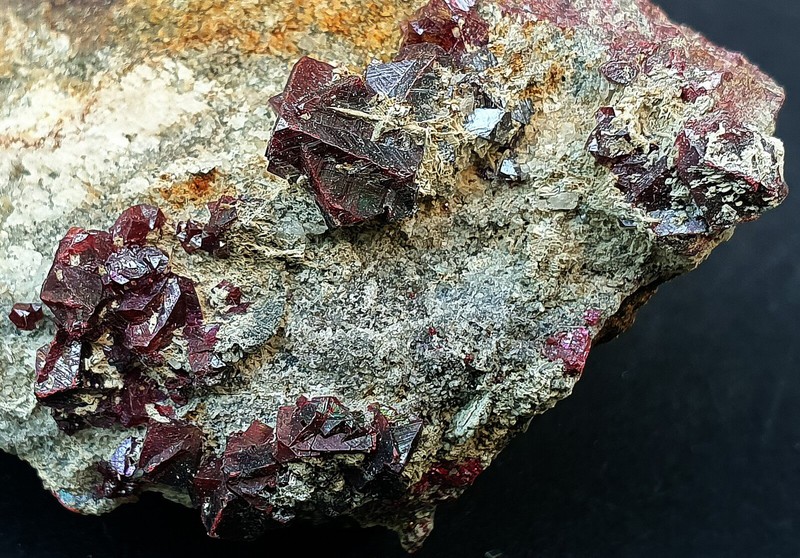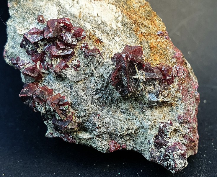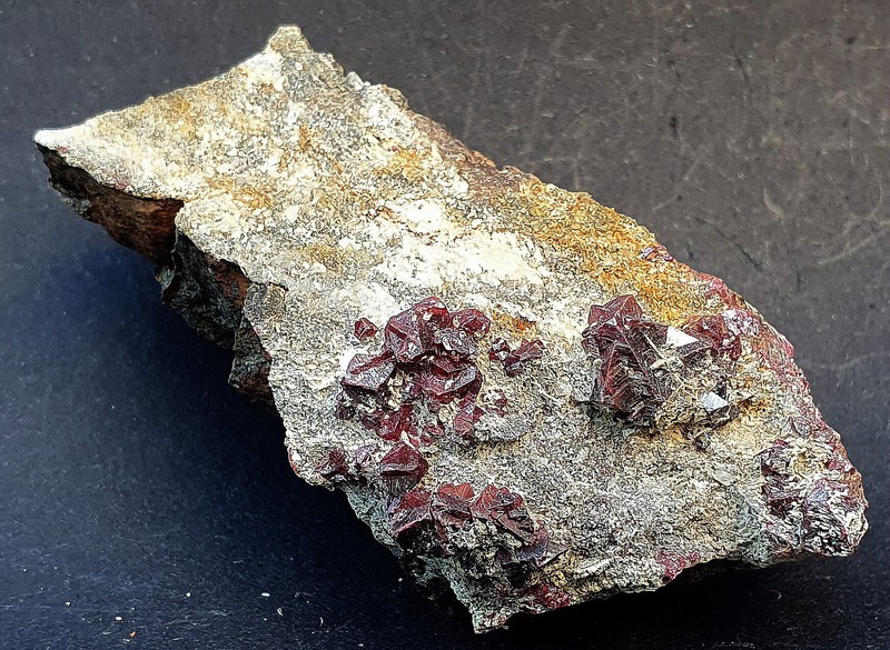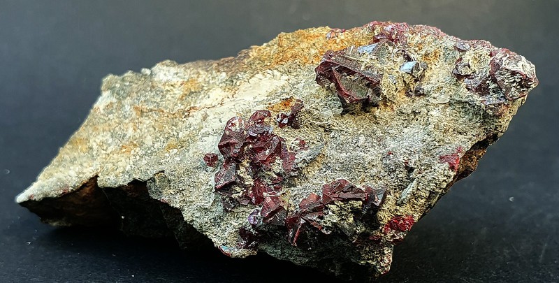 Auf einer Seite der Stufe sitzen mehrere teils ineinander verwachsene rötliche Cinnabarit-Kristalle bis ca. 10 mm. Teils zeigen sie typische Fräserkopf ähnliche Verzwillingungen. Dazu gehören unscheinbare winzige Quarze. Gewicht: 75 g.
