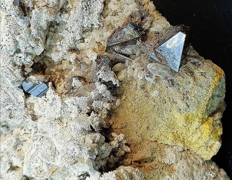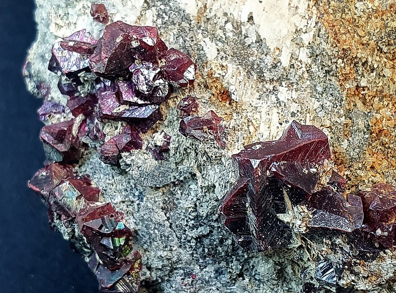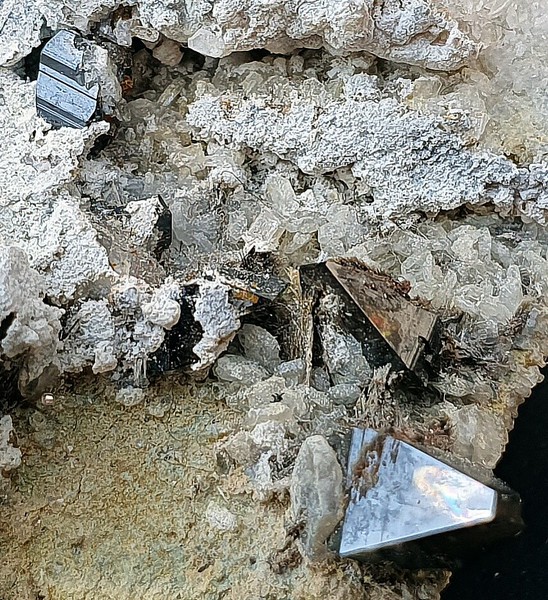 Diese Stufe trägt mehrere teils transparente und bipyramidale Anatas-Kristalle bis ca. 8 mm. Diese weisen eine rötlich-braune Farbe sowie hohen Glanz auf. Dazu gehören auf Albit-Rasen einige recht klare und flache Quarze bis ca.- 7 mm. Außerdem gibt es an den Anatasen Zonen mit zu bereits umgewandeltem Rutil, der feinnadelig und büschelig von Flächen der Anatasen absteht. Gewicht: 65 g.